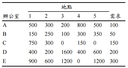 【已刪除】五、丁公司欲設置兩部影印機提供 5 間辦公室共同使用(假設兩部影印機欲設置在不同 地點)。目前限於空間使用問題,可供作為影印室之地點共有 5 個,而各辦公室 (A、B、C、D、E)之影印需求與至各可行地點之距離如下: