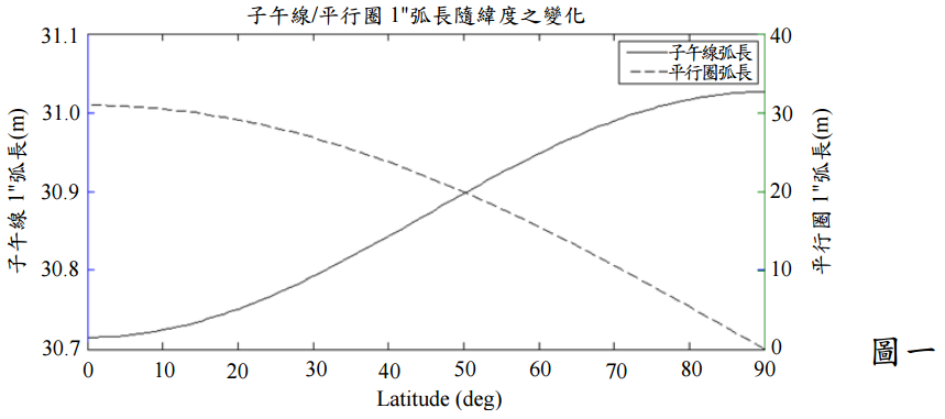 【已刪除】一、如圖一為 1"子午線與平行圈弧長隨緯度從 0°至 90°變化之曲線,請列出參考橢球體 之子午圈曲率半徑(M)與卯酉圈之曲率半徑(N)公式,並就赤道、南北極及一 般情形比較 M 與 N 之大小。(20 分)