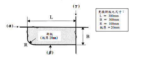 【已刪除】 ⑶為避免發生銲道裂痕,於割開舊銲道(α)及(γ)之 L及 B長度及部分加長割縫前,會 先於各該加長割縫端點打上止裂孔(stop hole),請指出止裂孔的位置以及各該加 長割縫之長度與位置?(3 分)