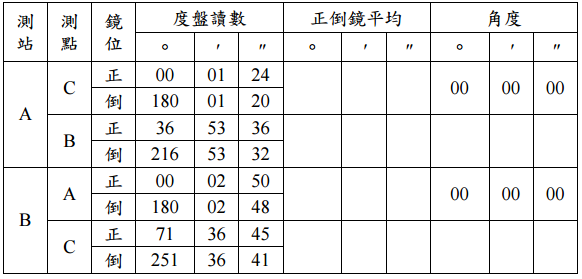 )為(400.000, 300.000)。 今有水平角觀測記錄如下,請依下列格式製表於答案卷上完成下表計算內容,並求 出點 C 坐標(E