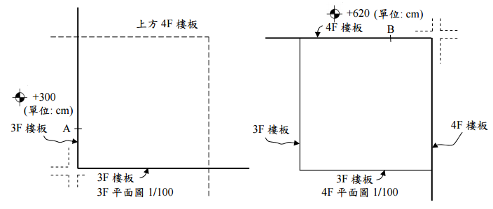 【已刪除】三、繪圖⑴:(40 分) 某建築 3 樓到 4 樓平面圖如下。樓板厚 15cm,邊梁 30 cm×40 cm。請繪製樓梯一座 (淨寬 120 cm)連結 3 樓 A 點到 4 樓 B 點。A 點、B 點均為約略範圍。請用尺繪 出樓梯平面(比例 1/100)、剖面(比例 1/30)、扶手細部做法(比例自訂),並 標註主要尺寸及做法。