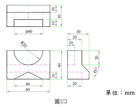 【已刪除】二、請繪出立體圖圖⑴之三視圖(不須標註尺寸,以比例 1:1 繪製)。(25 分)