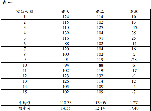【已刪除】四、某研究者想知道排行老大的智商是否高於老二,表一是 15 個家庭老大與老二的智 力測驗分數,請以適當的統計方法檢驗研究者的想法。請列出統計假設並詳述其檢 驗步驟(α=.05)。(25 分)