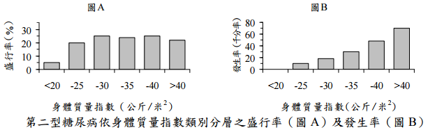 【已刪除】二、隨著生活形態日趨靜態化及高卡路里食品的攝取,導致肥胖成為全球性健康問題。目前最為廣 泛接受之肥胖測量指標為身體質量指數(BMI)[ 體重/(身高) 2 ,以公斤/(米) 2 為單位 ]。研究人 員遂以身體質量指數作為肥胖測量指標,針對設定之社區民眾進行身體質量指數分佈狀態與第 二型糖尿病盛行率(Prevalence)(圖 A)以及身體質量指數分佈狀態與第二型糖尿病發生率 (Incidence)(圖 B)關聯性之分析。請說明身體質量指數分佈狀態與第二型糖尿病盛行率 趨勢及發生率趨勢出現差異之原因。(20 分)