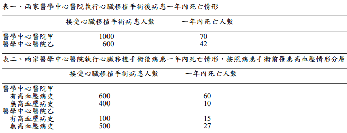 【已刪除】一、研究人員比較國內兩家醫學中心醫院執行心臟移植手術後病患一年內死亡率的差異,研究結果如下表 所示。研究人員發現兩家醫學中心醫院執行心臟移植手術後病患一年內死亡率都是 7%(表一)。研究 人員進一步按照病患手術前罹患高血壓情形分層統計分析(表二)。研究人員可以根據表一的統計結 果,下結論認為兩家醫學中心醫院執行心臟移植手術後病患一年內死亡率沒有差異嗎?根據表二的統 計數據,說明病患手術前罹患高血壓情形會如何影響比較結果?該如何處理?(10 分)