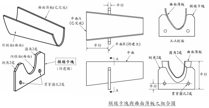 六、下圖所示之模線卡塊(contour board),係使用於定位曲面薄板。模線卡塊之內模面必須與 曲面薄板外模面完全貼合(contact)。假設曲面薄板之 CATIA V5 零件(Part)實體已完成並插 入組合件(Product)檔案內,請說明如何建構此模線卡塊之零件實體。提示(一) : 僅需依據 CATIA V5 零件設計(Part Design)方法,說明所需使用之 CATIA 指令 (command)及 3D 零件實體建構步驟,不需註明尺寸細節,也不需說明如何繪製2D 工程圖(Drawing)。所有 CATIA 指令都可以使用,不限於零件設計(Part Design )指令。 提示(二) : 建構步驟用語格式範例如下 : (注意範例內容未必與答案相關) (1)進入草圖繪製(Sketcher)模式。 (2)插入一個新的組合件(Product)。 (3)點選旋轉成形(Shaft)指令,選取螺桿草圖,旋轉 360 度,建立螺桿實體。 (4)點選加強肋(Stiffener)指令,設定肋厚,選取肋板草圖,建立加強肋實體。