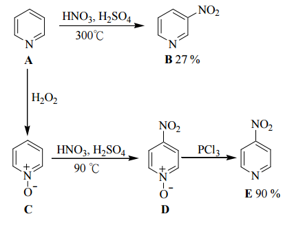 ,然後進行硝化反應得到對位取代產物 D, 最後以三氯化磷去氧而得到產物