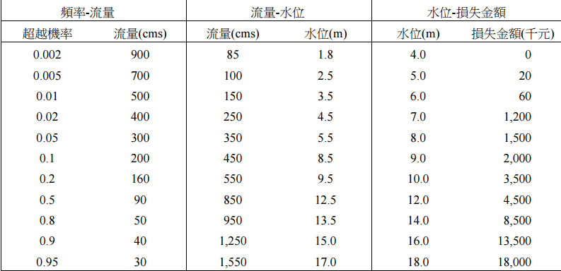 根據某地區的研究調查報告分析洪水的頻率-流量、流量-水位、水位-損失,關係表如下。請依下表計 算該地區每年損失期望值。【15 分】