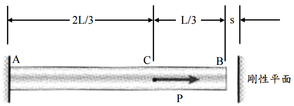 【已刪除】三、AB 桿件長度為 L,軸向剛度為 EA,A 端固定,B 端與剛性平面距離為 s,一軸向 負載 P 作用於離固定端 2L/3 的位置,如果由 P 所產生 A、B 端的反力相同,s 應該 有多大?(25 分)