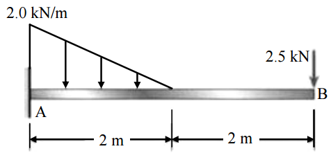 【已刪除】四、懸臂樑 AB 承受一三角形分布負載,以及一集中負載如下圖所示,假設該樑撓曲剛 度為 EI,請繪製其剪力圖與彎矩圖。(25 分)
