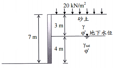 【已刪除】二、如圖所示之擋土牆高 7 m,牆背為光滑,地下水位在地表下 3 m,牆後地表荷載 20 kN/m