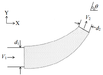 =100 mm,水由斷面 1 流入, 假設無能量損失,當 sinθ=0.8,求水對漸縮彎管的 X 向及 Y 向作用力。(20 分)