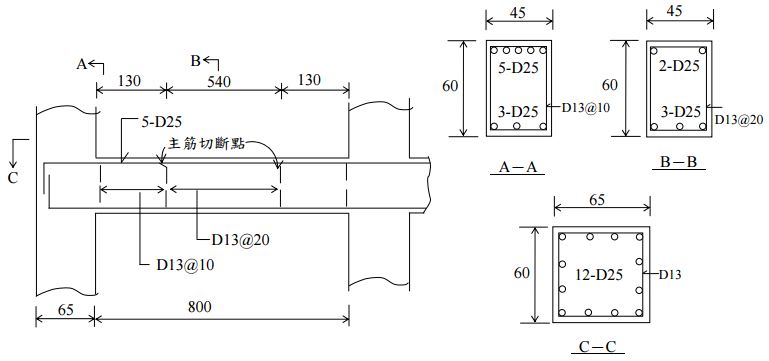 【已刪除】三、試檢核圖示 A-A 斷面梁頂部撓曲鋼筋之伸展長度。(25 分)