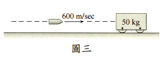 【已刪除】三、如圖三所示,一 200 g 子彈,以 600 m/sec 速度擊中並嵌入 50 kg 之木塊內部,木 塊原先為靜止,試求衝擊前之總動能、衝擊後木塊之速度及衝擊期間所損失的能量。 (20 分)