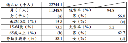 【已刪除】五、依據下表資料,先說明空格(a)、(b)、(c)及(d)之數值,再計算性比例、扶養比、老 化指數,且計算民間勞動力與女性失業人數。(30 分)