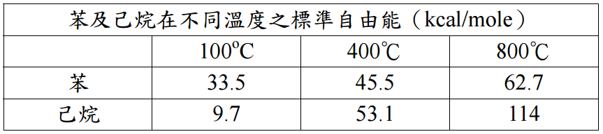 在不考慮其它反應發生,請由下列所提供之參數,估算出己烷生成苯轉化率達到 95%之最低反應溫度。(25 分)