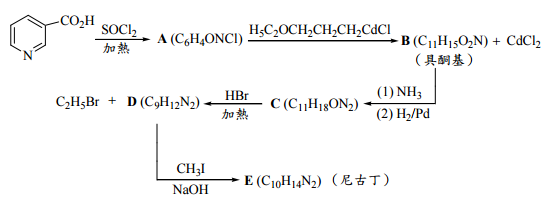 【已刪除】五、菸葉中的植物鹼、尼古丁,可以下列方式合成。試寫出中間產物 A 至 D 及尼古丁 E 的化學結構式。(10 分)