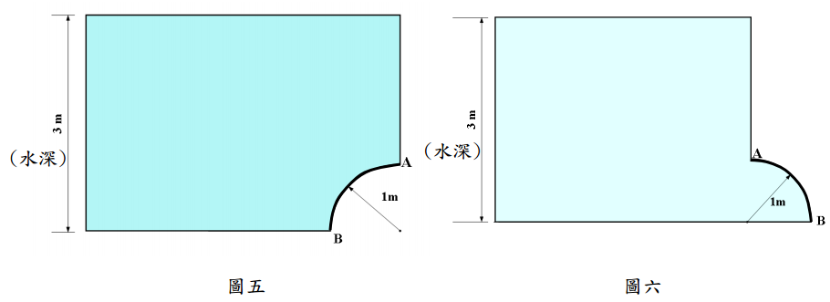 【已刪除】五、如圖五、圖六所示,閘門 AB 為半徑 1 m 的四分之一鋼管圓柱,情況(A)(圖五所示) 及情況(B)(圖六所示)分別為兩種用來密封水槽的開口的狀況(側視圖)。假設水 槽蓄水高度同為 3 m,水的密度為 3 ρ =1000 kg / m