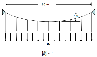 【已刪除】一、圖一纜繩結構承受均佈載重W=2 kN/m,試求此纜繩結構中之最大張力為何?(20 分)