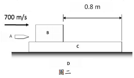 【已刪除】二、如圖二所示,一子彈 A 質量為 25 g,射入方塊 B,若射入時之時間 t=0 秒,方塊 B (質量 4 kg)與 C(質量 3 kg)間之動摩擦係數 μk=0.6,方塊 C 與地板 D 間之摩擦係 數μs=μk=0。試求子彈嵌入B 後,方塊B 與C 相對速度為0 時之時間t 為何?(20 分)