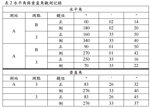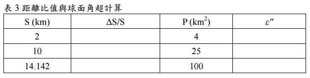其中,S 為所測距離長度;ΔS 為該距離在曲面與平面之差;R 為地球半徑 6371 km; ε" 為以秒計的球面角超,即為一空間三角形在球面上投影的各內角之和,較其在 平面上投影的各內角之和,所高出的值; ρ" 為以秒計弧度; P 為該球面三角形面 積。請於試卷上完成表 3 的計算,(12 分)並據以說明在此測區範圍內,施作前 述距離與角度測量,應視為曲面還是平面。(8 分)
