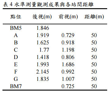 【已刪除】五、有公路開發之水準測量成果如表 4 所示。已知 BM5 與 BM7 之高程分別為 107.332 m 與 113.816 m。請完成該水準線之平差計算,並檢查是否合於規範12 K 。(10 分) 已知該公路設計在 BM5 與 BM7 兩點的高程不變,該兩點間保持為相同坡度,試求 B 點與 E 點應挖方或是填方多少高度?(10 分)