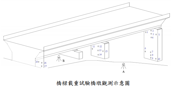 【已刪除】二、橋樑進行載重試驗,對於橋墩沉陷監測部分,擬採用多種觀測相互比較。其中一種方 式,將採用反光貼紙標示於橋墩上重要位置,再以全測站設置於已知點 A,稜鏡設置 在已知點 B,觀測各點角度與距離,得到各反光貼紙標示之坐標,如下圖所示。已知 A 點與 B 點坐標(E, N, h)分別為(100.000 m, 100.000 m, 100.000 m)與(50.000 m, 100.000 m, 75.000 m),點 A 到點 3 觀測距離為 50.659 m,且 A 點儀器高為 0.750 m。 今測得點 3 數據如表 2,詳列計算過程,求出點 3 之坐標(E, N, h)。(20 分)