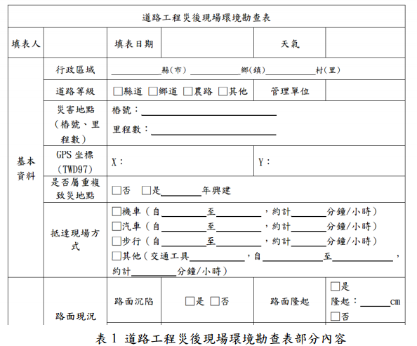 【已刪除】一、行政院公共工程委員會因應風災之後,擬執行大量災後現場環境勘查,以確認災害 地點,在道路工程方面,設計對應表格,其部分內容如下表 1,其中,對於現場環境 定位,採用「GPS 坐標(TWD97)」來註記。此道路工程災後現場環境調查 的空間定位精度,應屬於公分級的測量用途(surveying),還是公尺級的導航 用途(navigation)?(5 分)