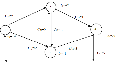 【已刪除】二、請以網路單型法(Network simplex method)求解下述之最小成本網路流量線性 規劃問題,其中 bi表示節點 i 其供應量(+)或需求量(-),節線