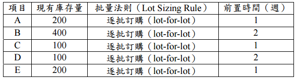 【已刪除】七、假設某公司以電腦進行物料需求規劃(Material Requirement Planning, MRP)時,在 產生零件 E 第 3 週的計畫訂單發出量(Planned-Order Releases)=100 後,即當機 無法再繼續進行後續規劃。該公司除了產品 A 的主生產排程(Master Production Schedule, MPS)外,其他 MRP 資訊均已經完成備份可以復原。假設零件 E 僅用在 產品 A 的組裝,請參考下列資訊來恢復電腦當機前產品 A 的主生產計畫。(15 分)
