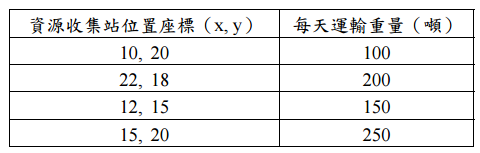【已刪除】四、某資源回收公司有 4 個資源收集站,該公司希望建立一個能產生最小運輸成本的資 源回收處理廠來處理回收資源。請參考下列資訊並用重心法(Center of Gravity)來 決定設置資源回收廠較好的位置。(四捨五入至小數點第二位)(10 分)