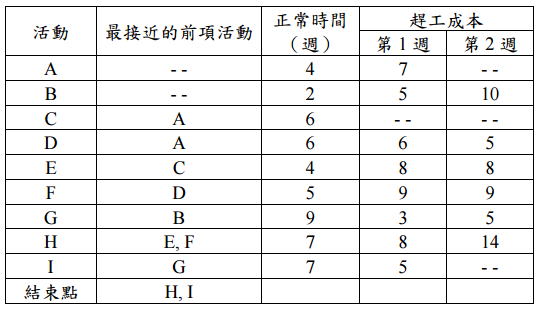 【已刪除】八、某一個專案的資料如下表所示。請決定可以縮短 3 週專案時間的最低成本趕工時間 表(Minimum-cost Crashing Schedule),並計算其增加的趕工成本。假設每項活動 趕工不得超過 2 週,專案的間接成本與懲罰成本可以忽略不計。(10 分)
