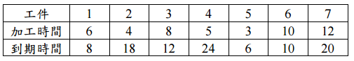 【已刪除】六、下表顯示在某工作中心等待加工的 7 件工件的加工時間(Processing Time)及到期 時間(Due Date)。此外,進行加工時部分工件必須依照下列順序完成:⑴3→5→1 →7 ⑵2→7。