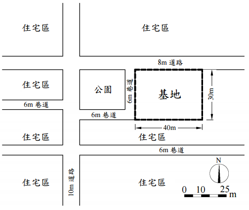 三、基地說明: 基地位於某社區之公有土地上,鄰近公園,面臨 8 M 道路,附近為住宅社區。本基地東西長 40 M,南北寬 30 M;建蔽率 40%,容積率 200%。