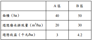 即 A、B 兩小區面積各為 40、50 ha,供森林遊樂使用時,各小區每一公頃預計分別 排放廢水 20 m
