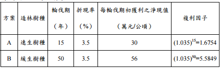 【已刪除】四、設某 100 公頃林地擬長期持續生產林木,經評估兩項造林方案結果如下表。試說明 此二方案如何評比,並導出其計算式?而評比結果為何?以上評比基於那些假設條 件?亦說明之。(15 分)