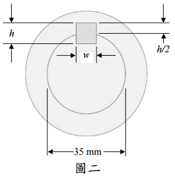 為 295 MPa 的鋼製鍵(key),連結直徑為 35 mm 鋼製的軸,如圖二所示。 當此輪軸需傳遞 40 N-m 的扭力,且安全係數為 3 時,試問: 考慮鍵受到剪應力,設計鍵的需要寬度 w?(13 分) 考慮輪轂受到壓應力,設計鍵的需要高度 h?(12 分) (注意:剪應力允許值為0 4. Sy ,壓應力允許值為0 9. Sy )