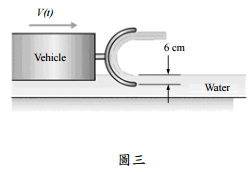 【已刪除】三、如圖三為一個質量為 5000 kg 的載具(Vehicle),以 900 km/h 的速度前進。其藉由 降下 20 cm 寬的勺子(scoop),浸入水中的高度為 6 cm 來達到減速。如果水會因 為勺子而產生 180 度的轉向,請計算出載具要減速至 100 km/h 之滑行距離。(25 分)