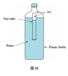 【已刪除】四、如圖四為一個含有部分空氣(Air)的倒置試管(Test tube),浮在填充水(Water) 的塑膠水瓶(Plastic bottle)中,且這水瓶的蓋子被緊緊地密封住。空氣的總量經調 整使倒置試管恰好可以浮起。實驗發現如輕微的擠壓塑膠水瓶將會造成試管沈入瓶 底。請解釋這個現象的發生且請以公式佐證。(25 分)