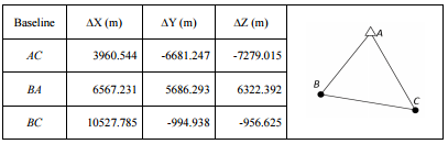 【已刪除】三、某 GPS 靜態測量網形如下圖,觀測得之獨立基線如下表。若 A 點為已知點,其坐 標為(-3015238.032, 4989314.847, 2582697.083),如今欲使用此觀測數據進行 GPS 靜態基線網形平差,以解算 B 及 C 點坐標,請列出所有觀測方程式,且以矩陣式表 示之,並說明最小二乘解算方法。(20 分)