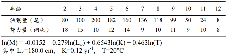 【已刪除】四、漁獲曲線(catch curve)法是常被用來估計全死亡係數(Z)的方法,請利用以下資 料及公式估計全死亡係數、自然死亡係數(M)及漁獲死亡係數(F)。(30 分)
