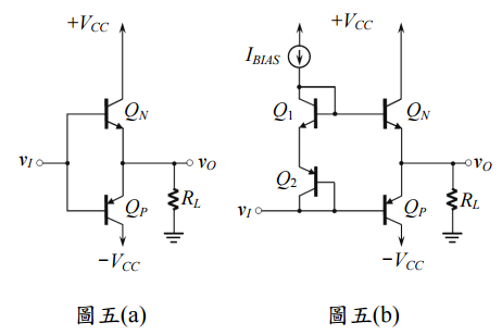 【已刪除】五、圖五(a)與圖五(b)之 AB 類放大器中,±VCC =±5 V,Q
