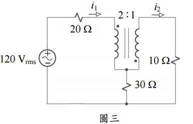 【已刪除】三、如圖三之理想變壓器電路,試求 10 Ω電阻所消耗之功率為何?(20 分)