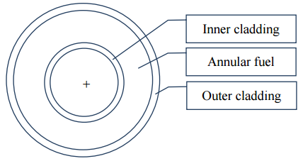 【已刪除】五、考慮一新型環狀圓柱燃料設計,環內及環外皆有鋯合金的燃料護套,而且都有冷卻 劑流通,橫截面如下圖。已知燃料功率大小、冷卻劑溫度、護套表面熱傳係數與其 他幾何和物理性質資料。請列出必要的微分方程式與邊界條件,以便計算燃料溫度 分布。你不必去求解,但要說明方程式及邊界條件的完整性。(20 分)