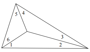 【已刪除】二、如控制測量平面網形圖所示,計有 6 個系統誤差改正後的水平夾角(deg)。基於 頂點到中點長度之不變性,全部角度能構成何種正弦函數代數關係?(20 分)