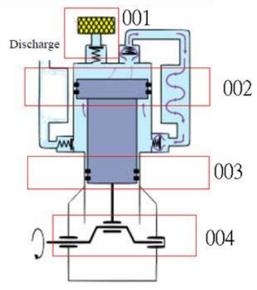 29.下圖為單缸二級式空氣壓縮機示意圖,其二級壓縮高壓端活塞之代號為何?