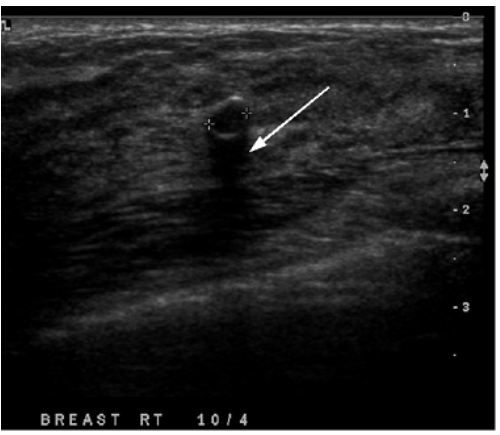 (A)正常乳腺組織 (B)囊腫後方的回音增強(acoustic enhancement) (C)鈣化性結構後方的音波衰減或音影(acoustic shadows) (D)臨界角假影(critical angle artifact)