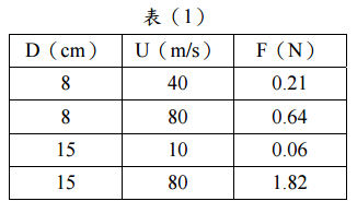 【已刪除】四、流體流過物體產生的阻力(drag force)一般可表為 ρ,D,U,μ 的函數,其中 D 為 物體的代表長度、ρ 為流體的密度、U 為流體的代表速度及 μ 為流體的動力黏滯係 數(dynamic viscosity)。如表(1)為某物體在風洞實驗(wind tunnel)所得的阻 力 F,實驗的空氣密度與運動黏滯係數(kinematic viscosity)分別為 1.2 kg/m