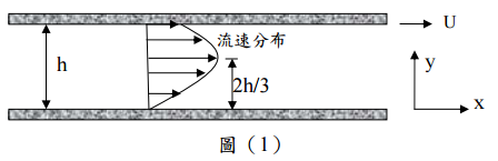【已刪除】一、如圖(1)為在間距 h 的兩個水平平板間的層流(laminar flow)流速分布,下層平板 是固定的,但上層平板以水平速度 U 向右移動。沿流向(x)的壓力梯度為 dp/dx, 流體的動力黏滯係數為 μ,若最大流速發生在距下層平板的上方 2h/3 處,求以 dp/dx、μ 及 h 表示水平速度 U 的公式。(25 分)