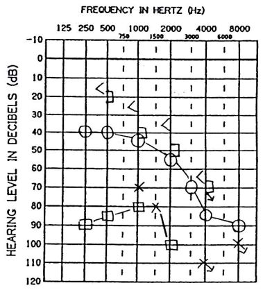 27 承第 25 題,該位病患治療後純音聽力檢查結果如下圖。下列敘述何者正確?